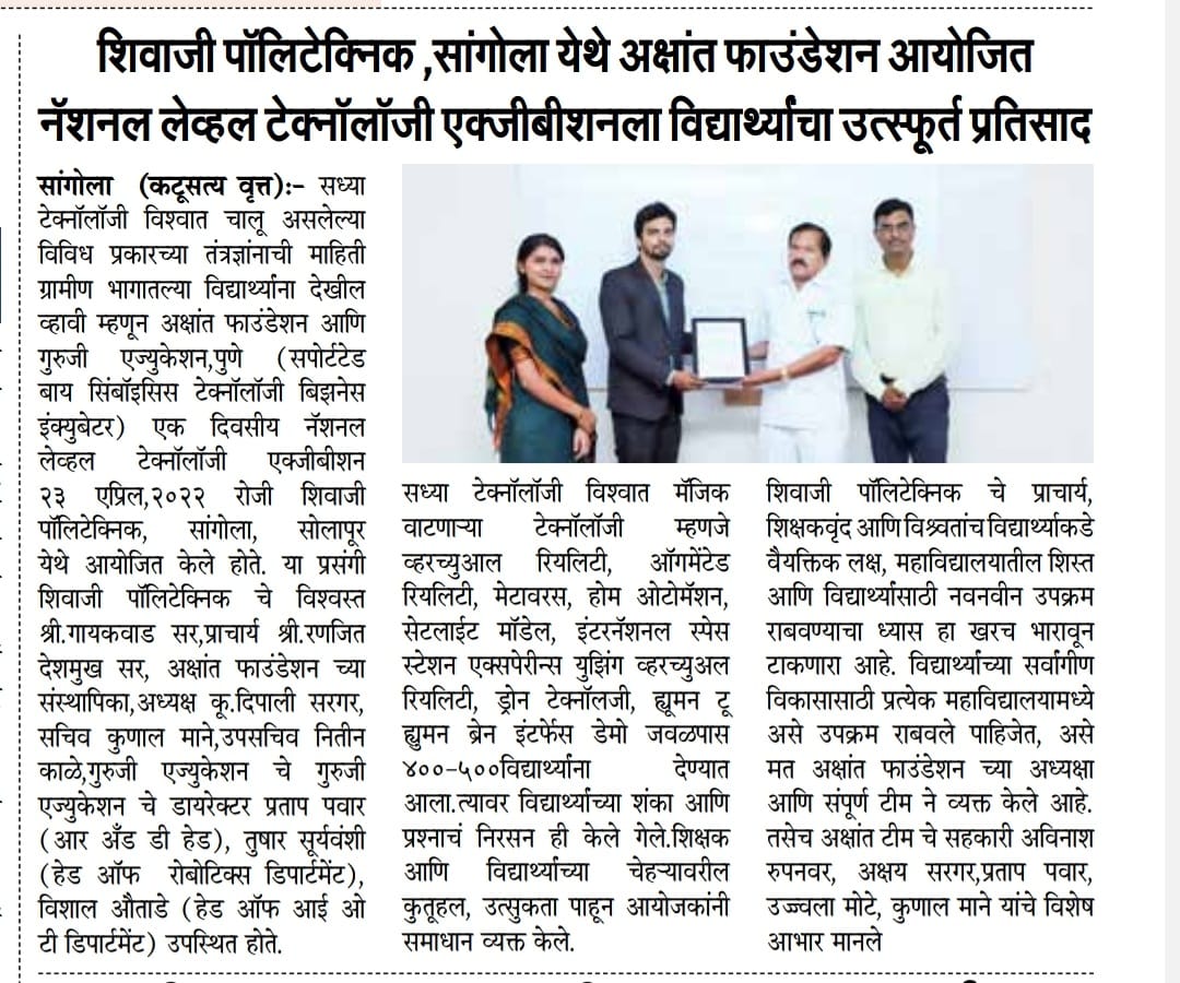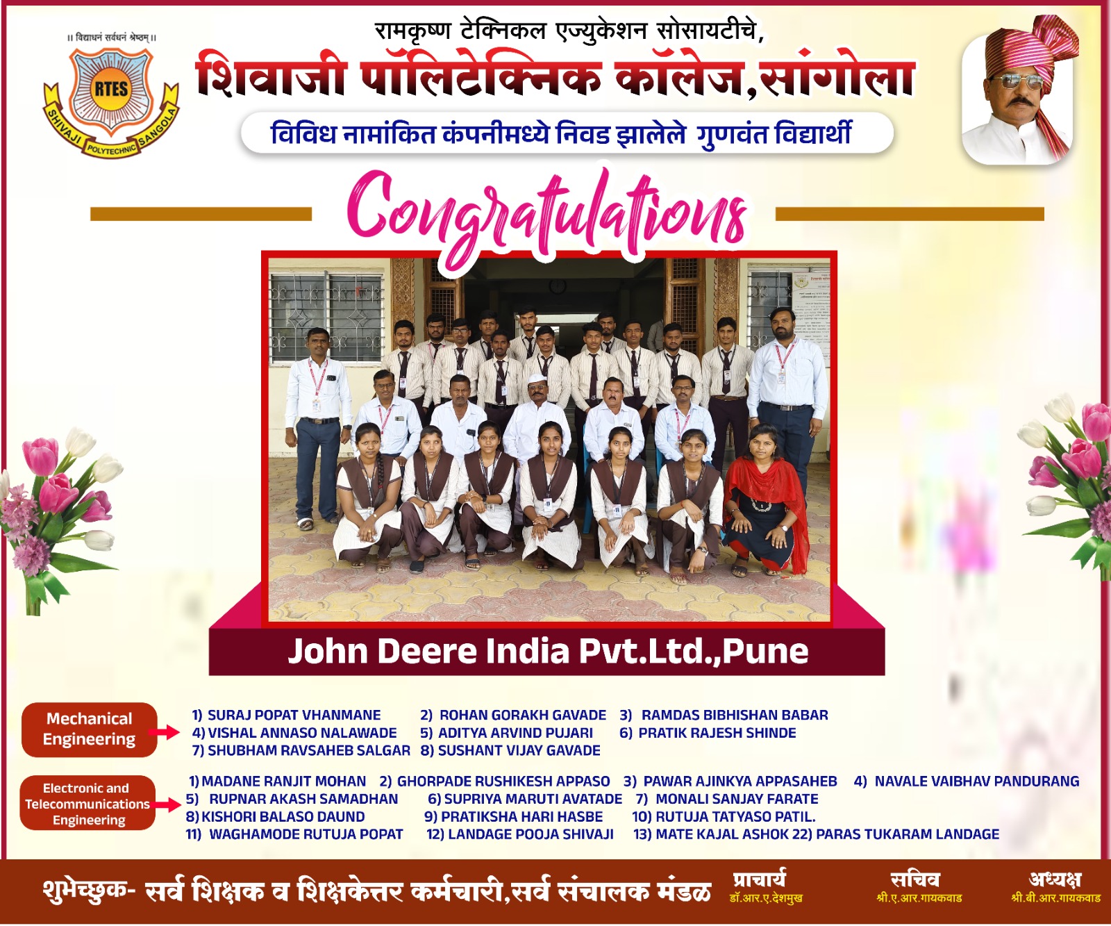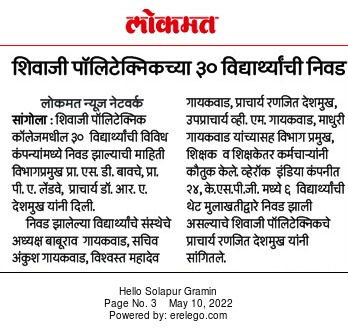 "शिवाजी पॉलिटेक्निक कॉलेजच्या 22 विद्यार्थ्यांची जॉन डियर कंपनीत निवड."