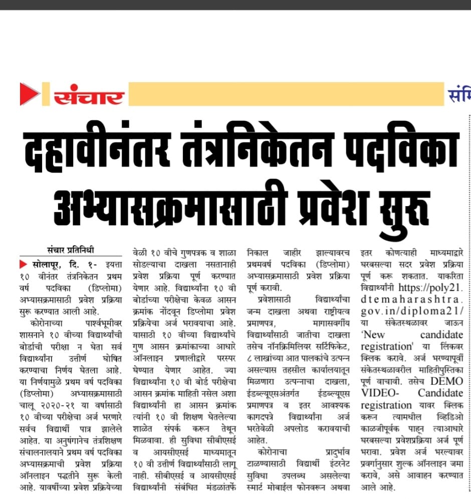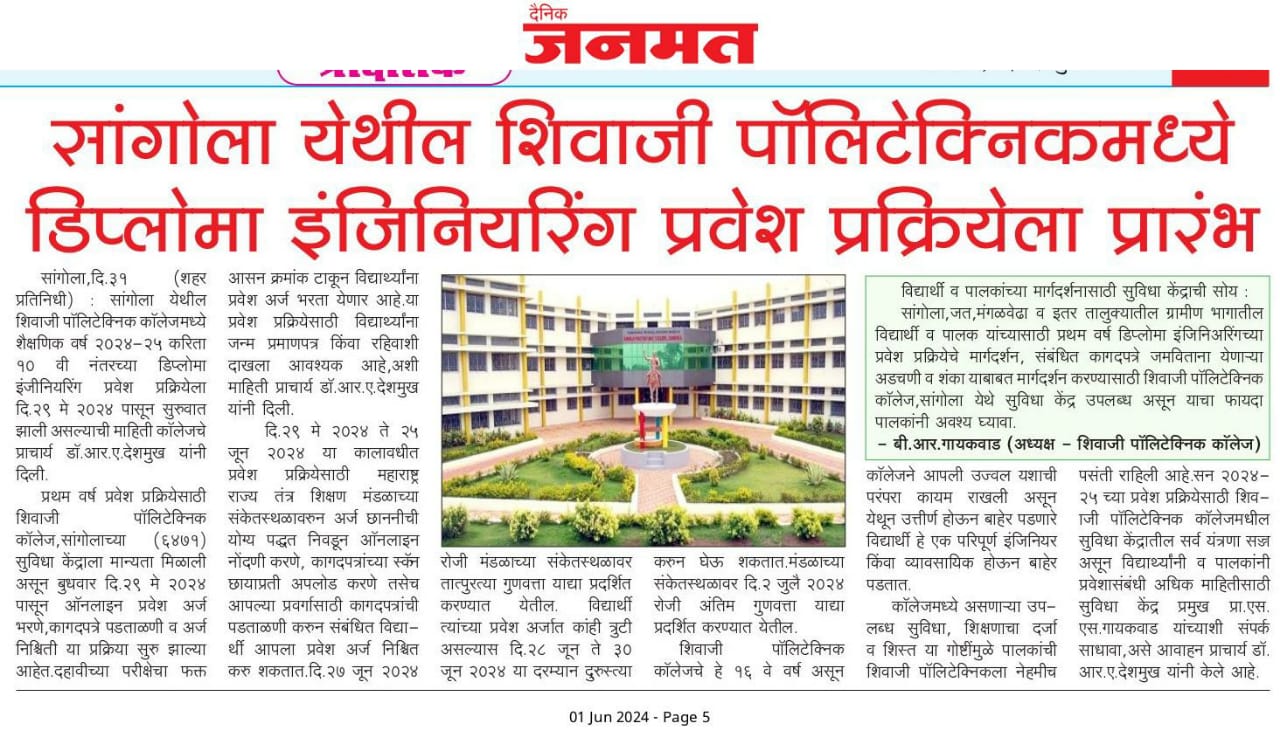 "सांगोला येथील शिवाजी पाॅलिटेक्निकमध्ये वर्ष 2024-25 डिप्लोमा इंजीनियरियरिंगच्या प्रवेश प्रक्रियेला प्रारंभ"
